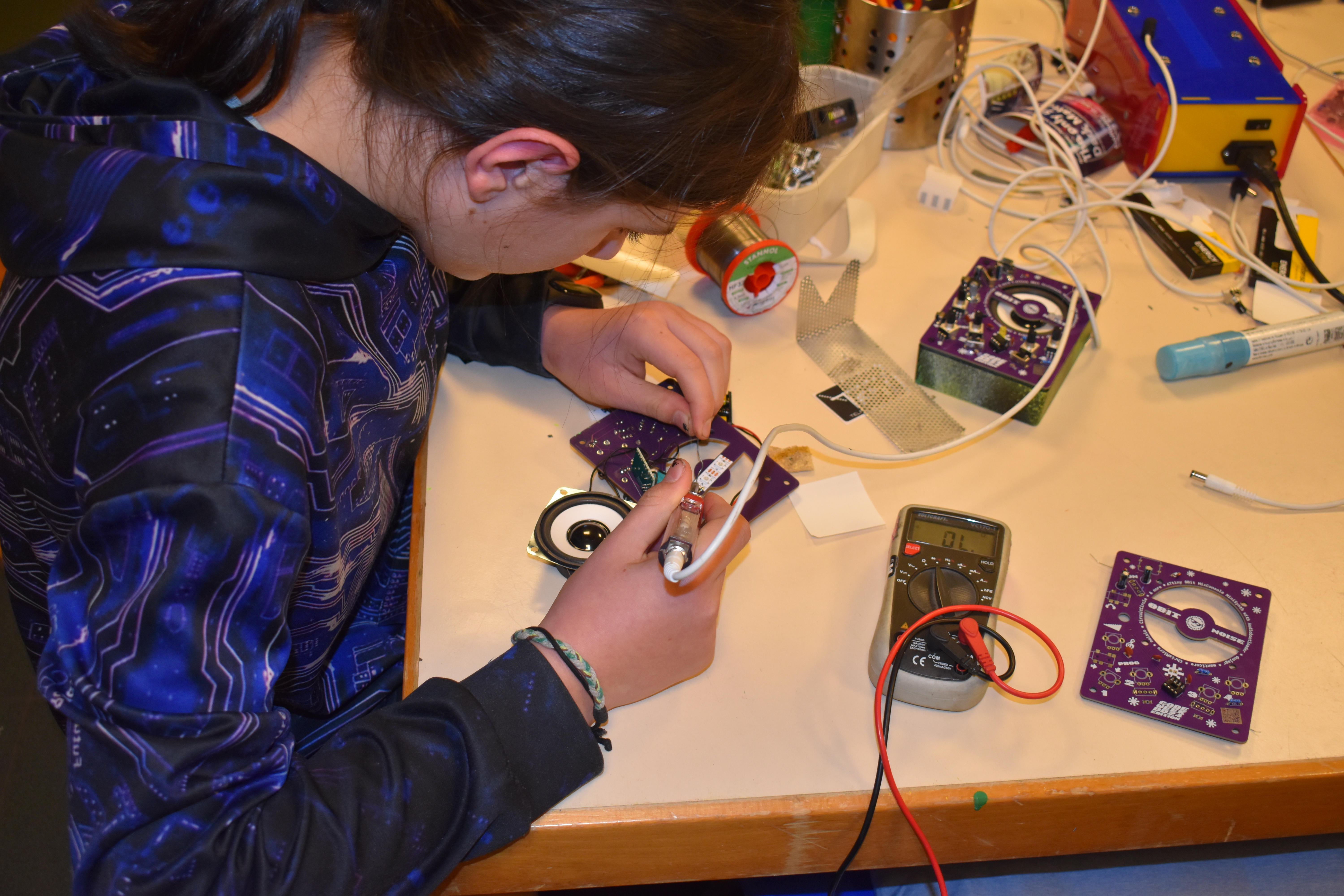 Im Kurs Silly Synth schraubten und löteten die Jugendlichen begeistert an ihrer eigenen Noisemaschine, die nach den Programmierarbeiten die abgefahrensten Sounds erzeugte. Gemeinsam testeten die Jugendlichen am Ende des zweitägigen Workshops ihre Werke.