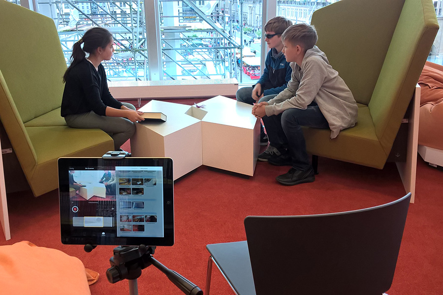 Dramatische Musik, Verfolgungsjagden, Regieanweisungen – Ereignisse, die man nicht gerade in einer Bibliothek erwarten würde. Und doch konnten Besucher der Dresdner Zentralbibliothek genau so etwas in den vergangenen Tagen erleben. Wo sonst auf Stille geachtet wird, wurden Kurzfilme mit Tablets gedreht. Im Ferienprojekt der Crossmediatour „Buch auf – Trailer ab!“ produzierten zehn Kinder Trailer zu ihren Lieblingsbüchern.