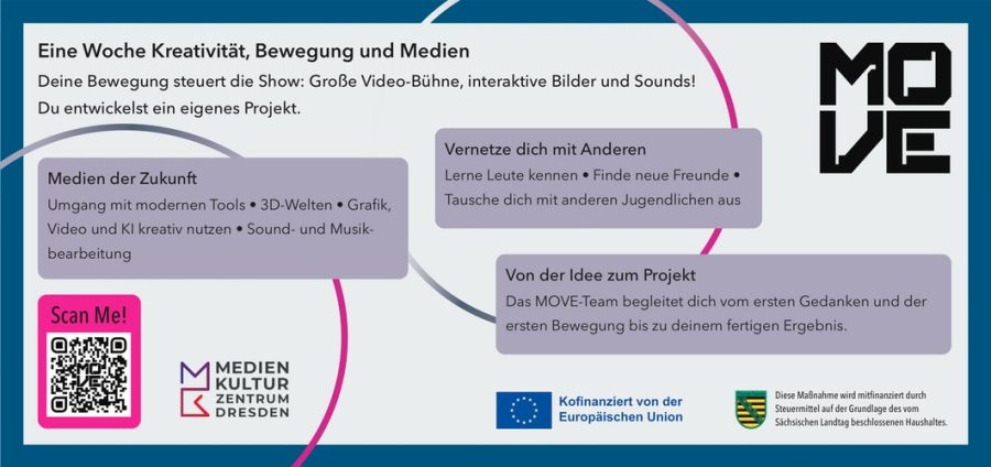 Mit MOVE Dresden startet das Medienkulturzentrum Dresden ein neues Projekt der kulturellen Bildung, das sich gezielt an Schüler*innen der Klassenstufen 7-12 richtet und künstlerische, körperliche und digitale Ausdrucksformen miteinander verbindet. Im Mittelpunkt steht das Schülercamp „MOVE – interaktiv, kreativ, gemeinsam“, eine intensive Projektwoche, in der junge Menschen Kultur aktiv erleben, gestalten und gemeinsam weiterentwickeln.