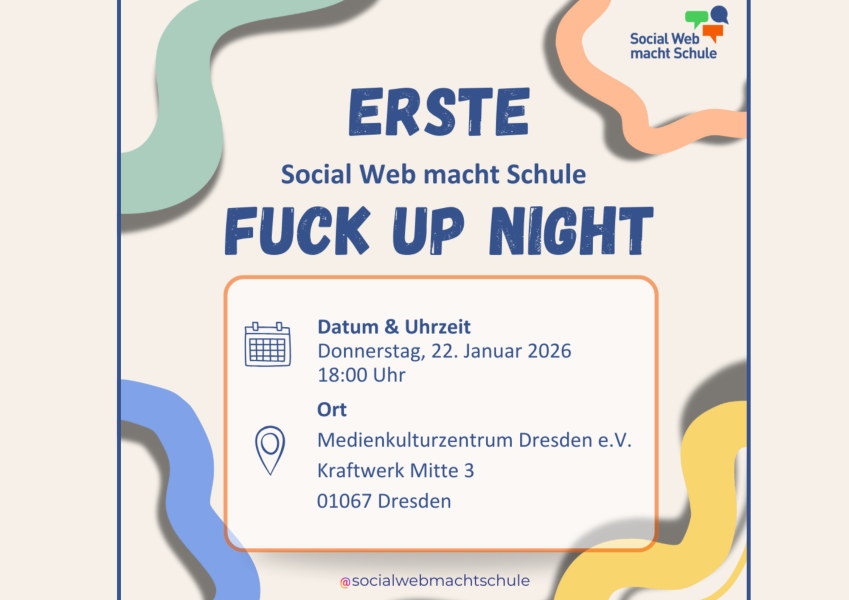 Es ist die Erste Fuck Up Night von Social Web macht Schule in Kooperation mit dem Medienkulturzentrum. Das Event findet im Rahmen des Projekts SCHNITT:STELLE Reaktanz – Lokaler Innovationsraum für Digitalisierung statt.